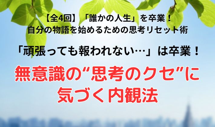 - 第1回:【思考のクセに気づく】 「頑張っても報われない」原因はこれだった!思考のクセに気づく内観法 (←イマココ)