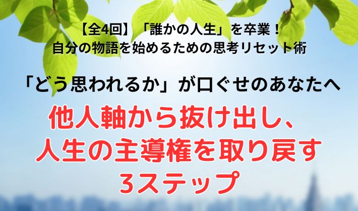 - 第2回:【他人軸から抜け出す】「どう思われるか」が口ぐせのあなたへ。他人軸から抜け出し、人生の主導権を取り戻す3ステップ (←イマココ)